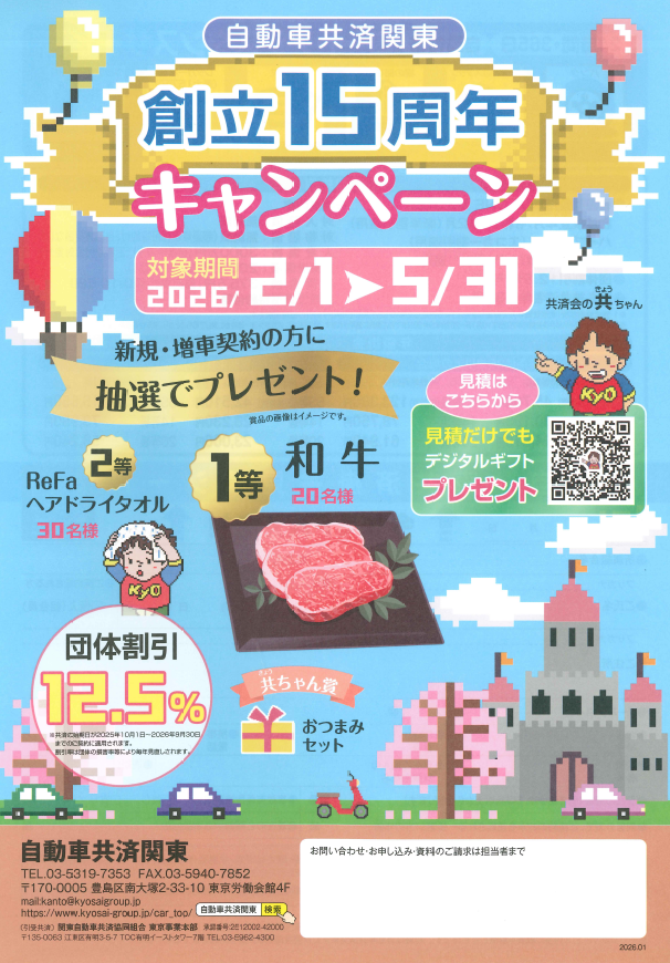 【5/31まで】自動車共済関東 創立15周年キャンペーン