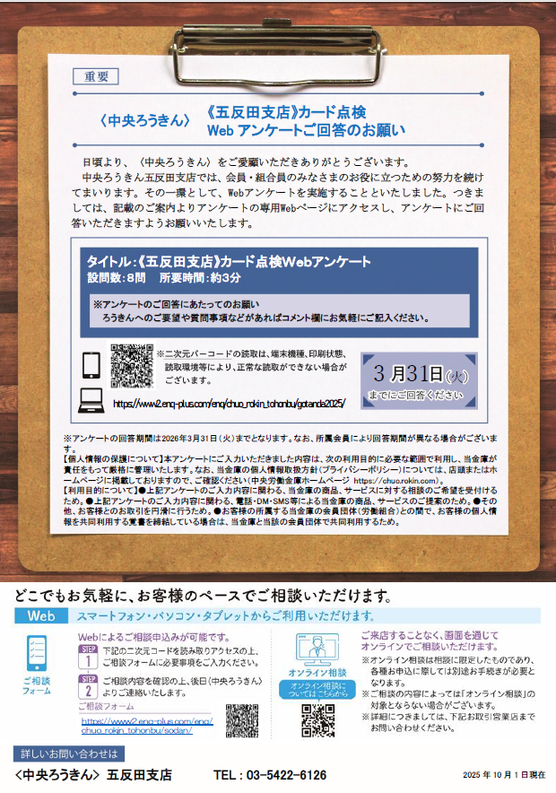 (3/31まで)ろうきん五反田支店 カード点検webアンケート